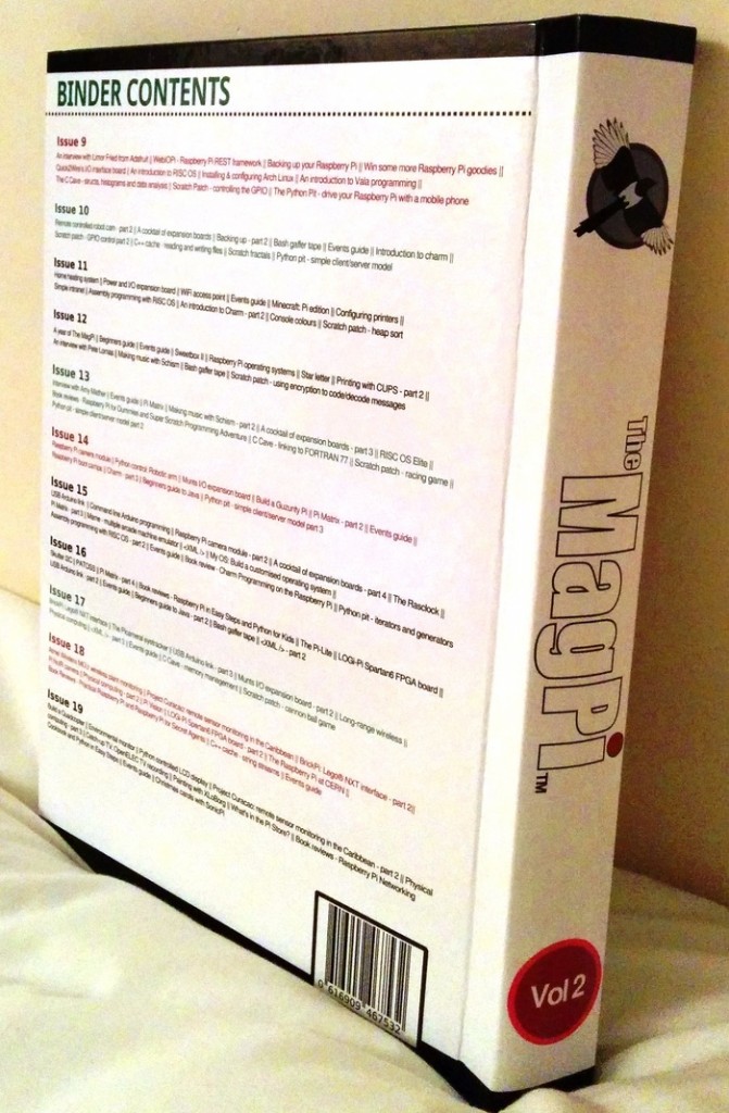 | The MagPi magazine is the single thing to have come out of the Raspberry Pi community that I’m proudest of, in a sort of godmotherly way – we at the Raspberry Pi Foundation do not have any association with The MagPi besides thinking it’s the best thing since sliced maltloaf. They’ve got a new Kickstarter running. The MagPi is a monthly free download, full of projects, tutorials, reviews and interviews about the Raspberry Pi. The magazine is staffed entirely by volunteers, and it’s just entering its third year of publication. Last year, the MagPi team served up a Kickstarter to bring the magazine to print, which proved really successful: print copies go down especially well if you’re using the magazine for reference or working through the tutorials. That Kickstarter meant that you could get hold of all of the first year’s magazine in a print version, with a handsome binder to put everything in. We have a couple of the first year’s binders filled with magazines in the office: the Pi Towers team finds the MagPi a really useful resource. Many people have asked for another binder for the second year’s print copies, having accumulated a heap of them at home. So Team MagPi are running a short-duration Kickstarter to fund manufacture of a binder for Vol 2 (i.e. every edition of The MagPi that came out in 2013). They’re keeping it to a two-week funding run because financing a binder costs them much less than last year’s bid to pay for printing what had been a virtual magazine. You can pledge at different levels, so you can fund anything from a sticker, an empty Vol 2 binder for yourself, a Vol 2 binder with all of last year’s magazines inside, or both volumes – complete, of course, with binders. The MagPi team don’t make a penny for themselves out of this: the project has always been run on a strictly voluntary basis, and it amazes us to see how the magazine continues to evolve, given that it’s run on a shoestring. They say: