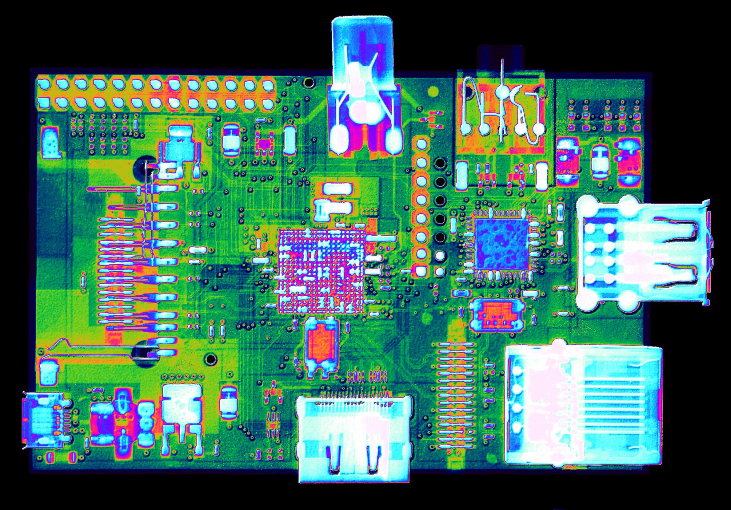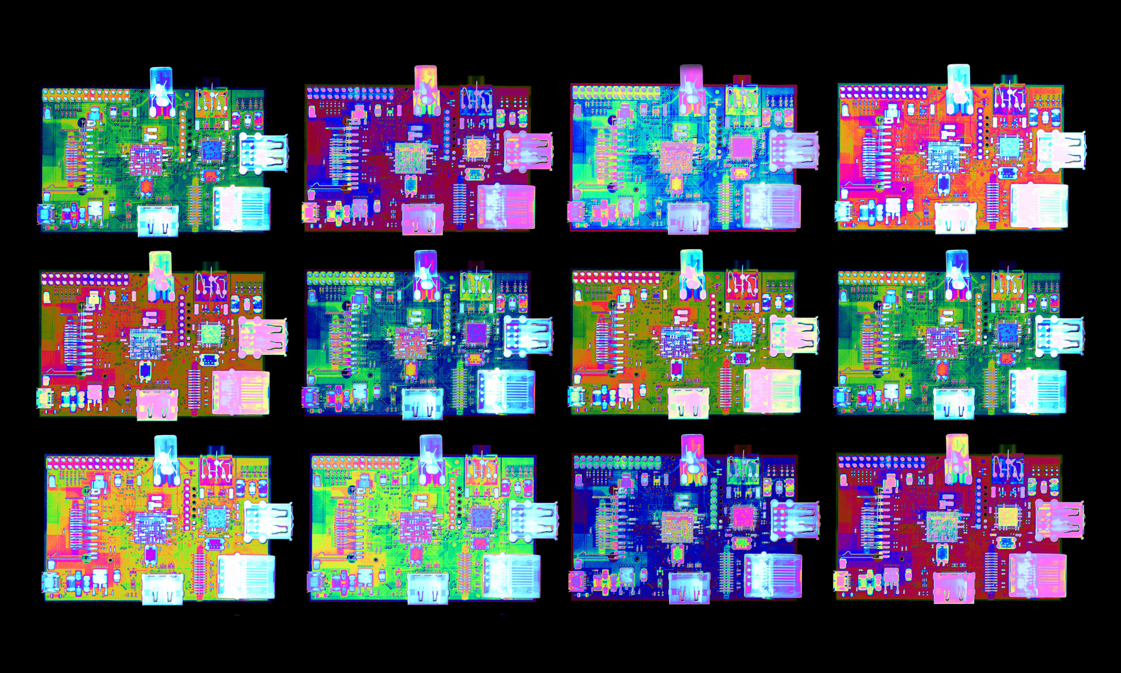 As always, you can click on any of these pictures to enlarge them. These Pis are colourised artificially. The original capture is monochrome: I’ve resized the largest pictures for this page, but you can find a 15MB .png of the monochrome image at Photobucket. The above image of twelve colourised Pis is also available as a larger .png – all the other pictures I’ve used here are the original .jpgs. Different colourisations make different features of the Pi more obvious and easier for the eye to parse: for example, the ball grid array (BGA) assembly of the stacked processor/memory package on package (POP) in the middle of the board is crystal-clear here, with its tiny dots of solder… …while the image below highlights the maze of tracks in all the layers of the board much more efficiently than the b/w original does. We’ll be printing some of these off to stick on the walls at Pi Towers. Thank you very much indeed, Steve. More power to your tartar-scraping elbow, and to that sucky thing that you stick under people’s tongues to get rid of all the spit. |