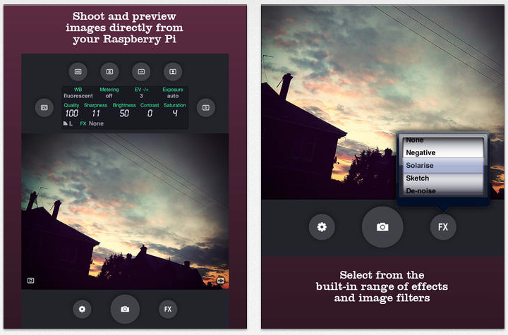 | We know that a lot of you have iPhones – and there are some very useful things you can do with a Pi and an iPhone already, not least using SiriProxy to get your phone interacting with objects in the real world. (Once I work out how to automate emptying the cat litter, I’ll be making sure I can ask Siri to do it for me just to add an extra layer of entertainment.) There’s lots of SiriProxy work going on in the forums – head over, sign up, and join in. But there’s more! James Moore has made BerryCam available for free: it’s an app that will allow you to control your Raspberry Pi camera board direct from your iPhone, over a local network, with a pretty interface. You can use the phone to shoot and preview images, easily access the various effects and filters we make available; and you can control settings like exposure and white balance direct from the phone. Images are saved to your phone’s camera roll and to the Pi. Now, we realise that this all added simplicity means that you won’t have to learn about SSH to view what your Pi is doing on another machine; or learn about giving the camera instructions from the command line. And, to be honest, we don’t entirely approve. It feels like cheating. So while we’d encourage you to give BerryCam a whirl for very compelling reasons of convenience, we’d encourage you even more strongly to try the camera without it first. Learning is good for your soul. You’ll find all the documentation you need to get going with the camera board right here, and plenty of help on the forums. And then you can download BerryCam and use it to your heart’s content. If SSH is new to you too, there’s a great tutorial from The Raspberry Pi Guy (not affiliated with the Foundation – Matt’s another of our ridiculously helpful community members) you should watch. Equipped with your new knowledge, you can go and use shortcuts (especially beautiful and well-presented ones like BerryCam) with a clear conscience. Thanks Matt, and thanks James!