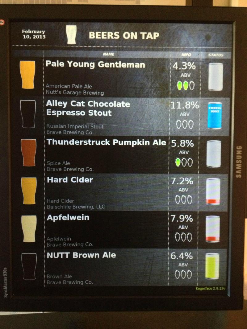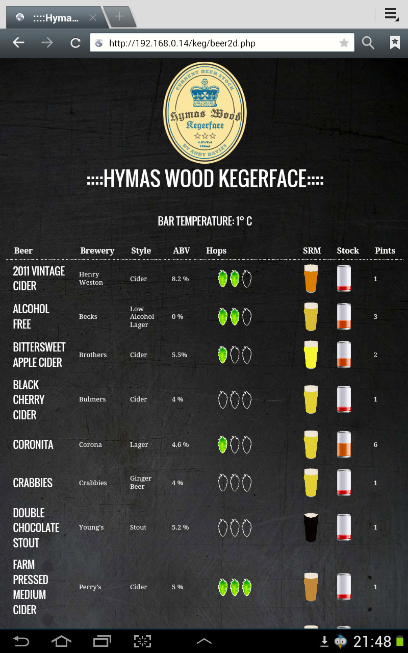 | Kegerface is a digital tap list display from SchrodingersDrunk, which you can read more about over on Reddit. It’s an interface for a Kegerator, hence the name. I had to look that up – a Kegerator is a device for dispensing draught beer in the home, involving all kinds of kit like a fridge and a tank full of carbon dioxide. In the picture below, it’s the thing with the spigots sticking out of it. We, of course, are interested in what’s going on above the spigots. The back-end here is some PHP which interprets data from a shared Google spreadsheet. The whole thing runs off a Raspberry Pi that’s attached to the back of the display. All the information you need is here: the type of beer, the ABV, the hoppiness (scored out of three – that’s what the green glyphs represent), the maker, and, most importantly, how much you have left. You can find SchrodingersDrunk’s code, along with assets like those hop graphics on Github. The Kegerface is under a CC licence, and other Kegerator owners have been modifying the setup for their own use. Andy Davies has done a lot of work on his own version. He’s tweaked the interface, and added the bar temperature and a breakdown of how many pints are left in stock; he’s also using MySQL rather than going the CSV/PHP route. Compare with the interface above, and spot the differences! (Click to enlarge.) We deplore your taste in ginger beer, Andy. Hollows & Fentimans’ hard stuff is much nicer. Andy’s also made the Kegerface work for bottled beer as well as draught beers, and best of all, has made stock updating easier by attaching an RFID reader to an Arduino, which is then hooked up to the Pi. So every time you take a bottle, you swipe the attached RFID tag across the bar, and the stock is adjusted on the Kegerface. Again, everything’s on GitHub if you want to try building one yourself. I’m trying to work out whether it’s legal for us to get one of these for the office. |