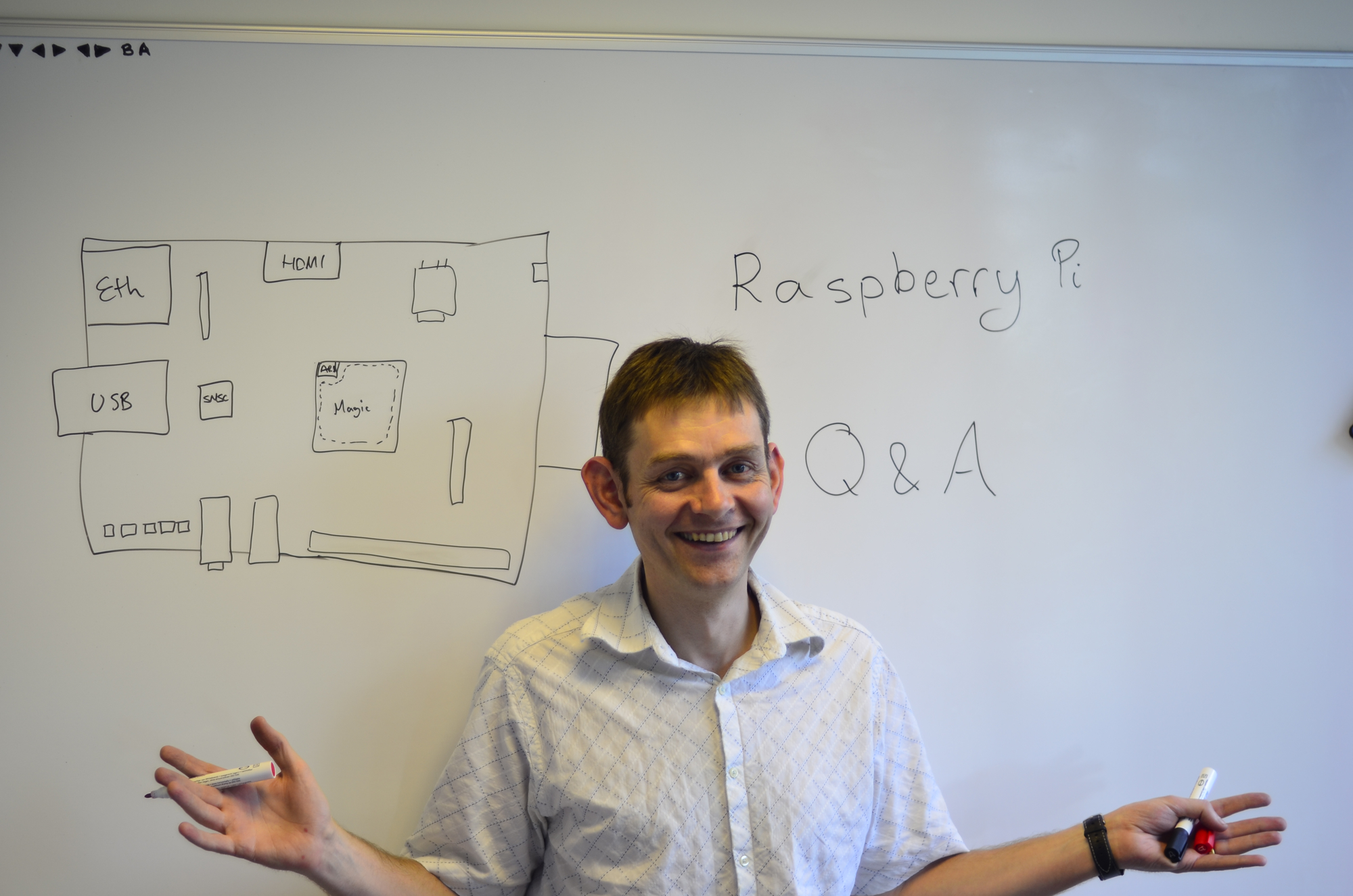 | Gordon Hollingworth, our Director of Software, is saddened that I called him out for being camera-shy the other day. So he’s offered to star in a new feature, which we’ll make a regular happening here if readers (that’s you!) like the idea. If you have a question about the Pi you’d like Gordon and his whiteboard to answer (we’ve hung it up properly and bought in pens of many colours just for the occasion), please leave a comment below. We’ll select a few of the most interesting ones and film Gordon’s responses next week. |