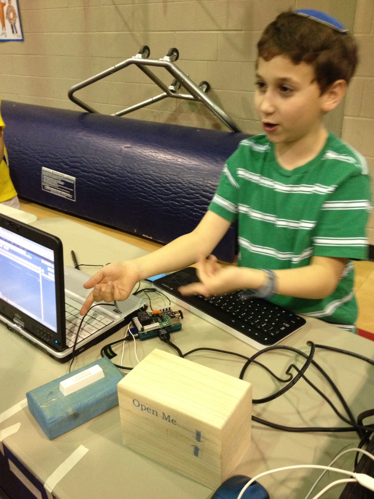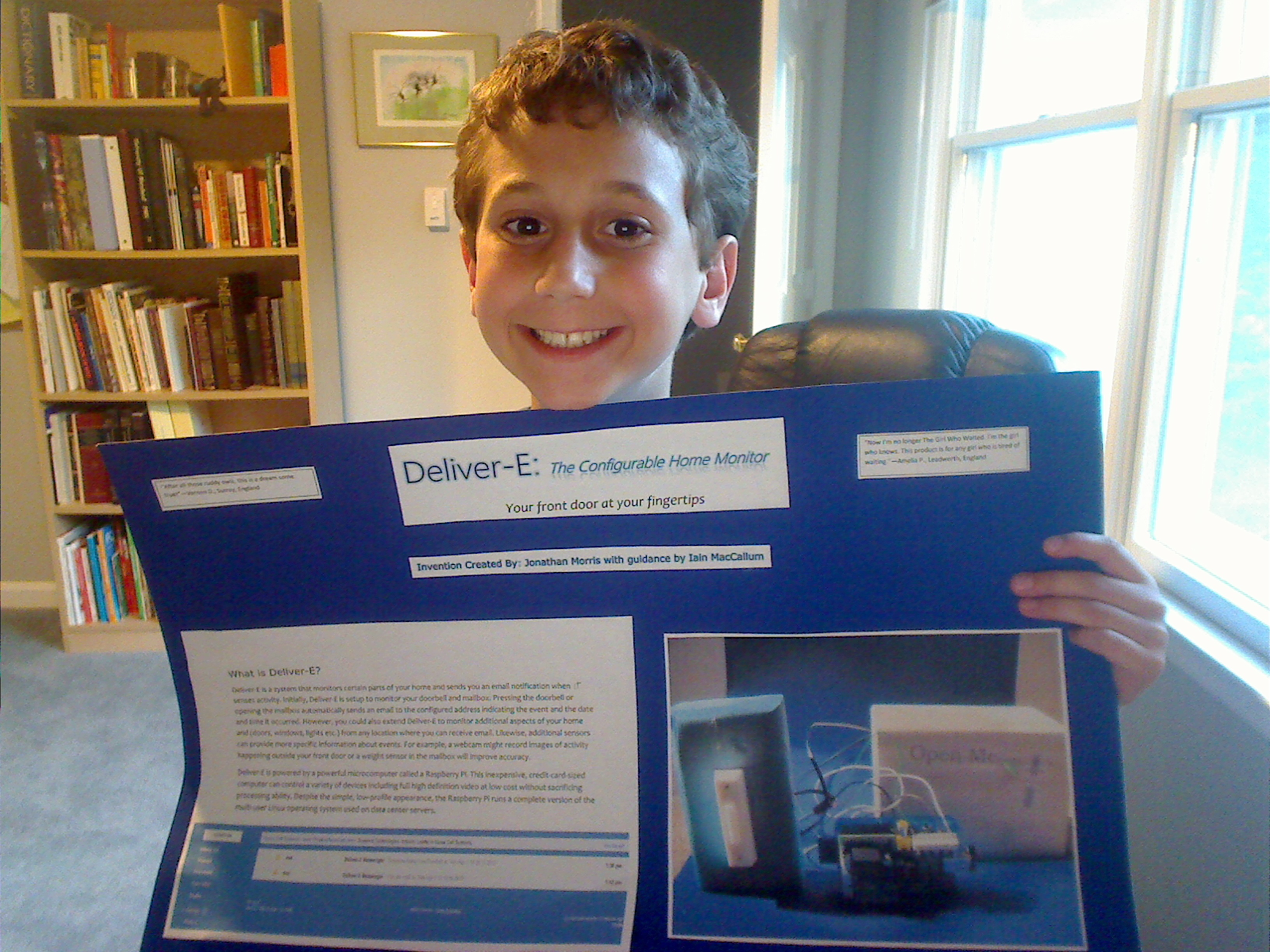 | I’ve spent much of today reading through the delightfully turgid folder of guest blog submissions and I was having a really tough time picking the next entry. Should it be technical? Educational? Just plain daft? Did it have enough documentation? Were the pictures good enough? Was it time for a glass of refreshing barley water? And then I found this short piece from Jonathan Morris. In two hundred words and a couple of pictures, Jonathan sums up what we do at the Raspberry Pi Foundation far better than I ever could. Thanks Jonathan, we love what you are doing! Hello, My name is Jonathan Morris. I am 10 years old and you guessed it…American! For my birthday this year I received a Raspberry Pi. I was overjoyed! I wanted to put my Pi to use so I waited and waited for a good opportunity. My Fourth Grade class had been studying the Industrial Era and our final Project was the Invention Convention. The Invention Convention is where you become the inventor (Instead of studying one). (By the way the project’s name is Deliver-E.) So I bought a small wooden box and a doorbell. Using a Python script and a PiFace Digital, I programmed the mailbox and doorbell to send you emails when either rung or opened. For instance if rang the doorbell, you would receive an email saying “Someone rang your doorbell at (Date/Time).” Same with the mailbox. When I checked the inbox of the project’s Gmail, I had over 115 emails! As of now I am integrating a USB Webcam into the project so when you ring the doorbell it takes a picture and attaches it to the email so you can see who exactly was at your door. |