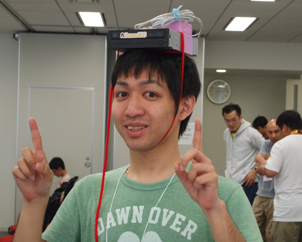 | I met Akira Ouchi – or Akkie, as he prefers to be known (his site’s in Japanese, but you can use an auto-translation service) at the Big Raspberry Jam in Tokyo back in May. Although we didn’t have much, if any, language in common (besides Python), we became friends instantly. Largely because he had strapped a Raspberry Pi and a CD-ROM drive to his head, and kept issuing the whole system an eject command while shaking my hand warmly. I noticed a different approach to hobbyist electronics in Japan. This is a broad generalisation, but it does hold some water: here in the west, we have a tendency to spread ourselves very broadly in our approach to projects (a carputer one week, a garden sprinkler the next). We noticed that our Japanese friends tend to explore a single idea very, very deeply and thoroughly: so rather than making a good-enough project and moving on to another, people like Akkie will take a single, simple idea, and refine and push it to a degree that…it’s either madness or genius. I’m still not sure which. So. On the day, Akkie went on to give a presentation about what he was doing with the CD drive and the Pi. As well as making a fine fashion accessory, he hooked the kit up to the Twitter API, so whenever someone favourited one of his tweets, the eject mechanism would trigger. Call it an alternative to an LED notifier. (Akkie is @Akkiesoft on Twitter, and you should follow him even if you don’t speak Japanese, because as well as being able to trigger his CD-ROM drive, you will discover that the man is a savant of 140-character ASCII art.) Akkie then gave me a little sticker he’d had made, with a CD-ROM drive on it. Later on, Akkie attached a pencil to the CD-ROM drive and demonstrated that it could be used as a remote-control for his antiquated air conditioning system, which does not have its own remote. He triggers the Pi and CD-ROM drive with a web app and this time, instead of acting like an LED notifier, it works like a solenoid, and presses the on button on the air conditioner. And then he showed it working as a hamster feeder. On New Year’s Eve, it rang a bell to welcome in the New Year. Since then, Akkie has refined his hat. (The original version was not well-adapted to a culture where you have to do a lot of bowing.) He has also become a published author: he contributed a chapter (which I can’t read, but I bet it’s great) to the Japanese Raspberry Pi User’s Guide. See if you can guess what it’s about. I have a picture of Akkie wearing a maid’s costume at the party we went to after the Big Jam (he had borrowed it from an NEC engineer), but he probably wouldn’t thank me for showing it here. So instead, here’s a picture I took of a picture Yuriko-san took of Eben, to whom Akkie donated his headgear for the evening. I post this because I want to impress on you that sometimes simple ideas can have more application and potential than we imagine – we tend to write about huge, complicated systems here, but there’s beauty in simplicity. And I post it because I really miss our Japanese friends; the Raspberry Pi community there is huge, imaginative and more friendly and generous than any other group we’ve met. We’re hoping to return in 2014. Until then, check out Akkie’s eject gubbins on GitHub, and let us know if you can think of any more applications for his helmet. (☝ ՞ਊ ՞)☝ウイーン, Akkie! (See. I’ve been practising.)