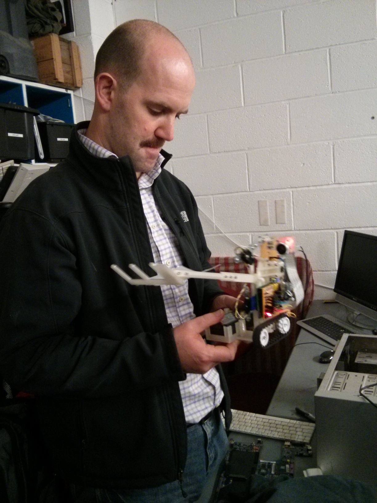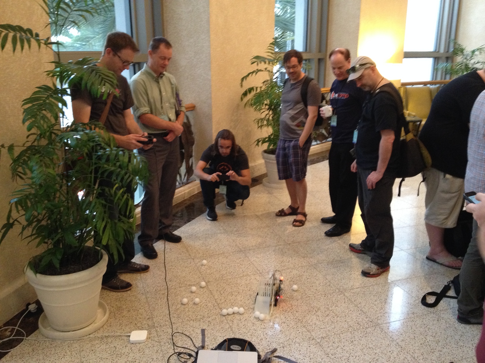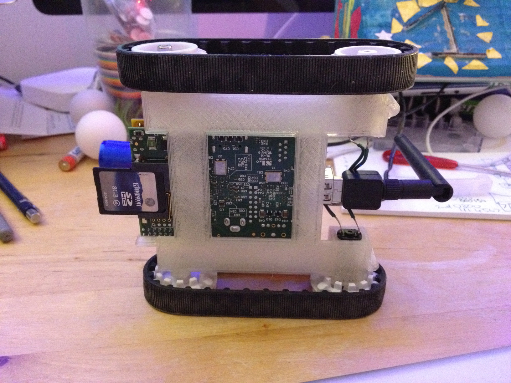 | Will Jessop is a systems administrator for 37signals and he runs the North West Ruby User Group in Manchester. I bumped in to him recently and discovered he was working on a personal project with a Raspberry Pi. The aim of the project is to solve the problem of ping pong balls on the floor at the 37signals office in Chicago. The solution is a web-enabled robot with mounted camera allowing people to collect balls in to a basket. The original version of the robot used the Custard Pi breakout, and then I suggested he looked at the MotorPiTX motor controller developed by Jason Barnett. He ordered one and joined Manchester Hackspace and began working on building or otherwise sourcing all the parts needed for the robot. Finding the new motor board much neater sitting on the original chassis, Will proceeded to design and 3D print motor mounts, caterpillar track mounts, a new base, a ball basket, and then added a mounted picamera with fish-eye lens. With a neat little camera robot, Will looked at options for battery powering it so it could roam free. Looking at power requirements and testing its usage while running the motors and streaming video over wireless, Will opted for a 5000mAh 7.4V lithium battery. He also added a lifter arm to the chassis, controlled independently of the robot itself. All the software on the Pi is written in Go, which Will sees as a great language for the Raspberry Pi as it creates small, efficient, statically compiled binaries that easily fit within the resource limits of the Pi. This runs alongside Will’s gamepad library (in C, available as a Ruby gem) on a laptop. Will also wrote a power control script to aid clean Pi shutdown via the MotorPiTX. With the robot roaming free on its new battery, controlled by an xbox controller, the camera feed streaming over wifi, and the lifter arm functional, it was ready to present at the 16th Manchester Raspberry Jam! On a tour of the Manchester Hackspace during the Jam, Eben, Liz and Pete got to see it in action. Eben got hold of the controller and took it round picking up ping pong balls by watching the video stream on the laptop. Will then took the robot to Miami to show it off at RubyConf, where many Rubyists got to have a play with it. Robot picking up ping pong balls: Robot’s eye view: Check out the series of posts on Will’s blog. Thanks to Manchester Hackspace and Jason Barnett for helping to facilitate the project. The robot’s not been placed in the 37signals office yet, but when web access to it is available, we’ll be sure to post the link so you can all have a go! Will also wrote a Go library for the Pimoroni Piglow: github.com/wjessop/go-piglow. Go and take a look, have a play, and let us know what you think! |