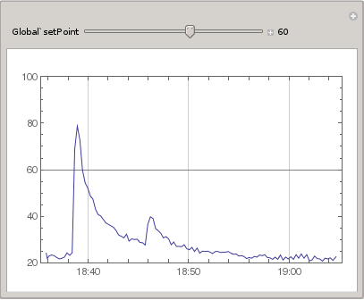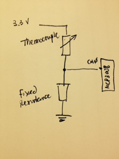 | Here’s another guest post from Allison Taylor at Wolfram Research. We’ve seen sous vide applications before – but we’ve never seen one that uses the Wolfram Language and Mathematica to describe elegant curves while it prepares your dinner. Thanks Allison, and thanks to Diego Zviovich, who came up with this project. Diego Zviovich, another one of our ambitious power-users of Mathematica and the Wolfram Language on the Raspberry Pi, has managed to (affordably) master the science of sous-vide cooking! For those who aren’t familiar, sous vide is a modern cooking practice where the food is first put into airtight bags and then cooked in a water bath at a very precise temperature. The result is perfect, evenly cooked meat or fish, with much greater penetration of flavours from any marinade you might be using. Actual sous-vide cookers cost hundreds (or thousands) of dollars to buy, but with a few sensors, a crock pot, and your Raspberry Pi with Mathematica installed, you can create your very own sous vide at a fraction of the price! What you'll need (along with your Raspberry Pi + Wolfram): The 5V 2-relay control module will be used to control the power to the crock pot. We'll be automating this switch to turn on and off depending on our thermocouple readings, maintaining the appropriate constant temperature that we want. A walk-through for setting up a circuit and connecting the relay from your crock pot to your RPiPi can be found in this handy YouTube tutorial. Once set up, turning the crock pot on and off with the Wolfram Language is very straightforward. To turn it on: DeviceWrite["GPIO",17->1] And to turn it off: DeviceWrite["GPIO",17->0] In order to get the temperature readings using thermocouples, we'll need to set up an analog-to-digital converter—since the GPIO on the RPi does not have analog pins. A wiring diagram for the MCP3008 can be found here. We'll only be using two of the eight analog sensors for our two thermocouples (one for the water bath and one for the food probe). They must be connected to the CH0 and CH1 inputs of the MCP3008 in the following way: Once you've decided at what temperature you want to cook your food, you can conduct a simple experiment to determine the ideal fixed resistance value that you will need to effectively maintain it. Using your thermocouples, a regular thermometer, a voltmeter, and three glasses of water—one iced, one warm, and one hot—take three temperature measurements and three resistance measurements (one from each glass of water) and fit the data to a curve using Mathematica. Using Diego's data as an example: temp = {20.6, 42, 83.3} + 273.15 resistance = {220650., 95800., 26340.} data = Transpose[{Log@resistance, Log@temp}] lm = LinearModelFit[data, x, x] lm[{"RSquared"}] The model above fits very well (R^2=.998), so we can use the curve to find the expected resistance at our desired temperature. For this example, let's say 60 degrees Celsius. invdata = Transpose[{Log@temp, Log@resistance}] Fit[invdata, {1, x}, x] (*74.3895 - 10.9297 x*) f[x_] := 74.38949510675315` - 10.929736543045369` x Exp[f[Log[60 + 273.15]]] (*54344.9*) From these results, using a 56K resistor for the thermocouples will provide the appropriate temperature range we need. To read the temperature values from the thermocouples, we will need to probe the analog inputs from the MCP3008 through the GPIO. We will develop a function to do this, using two libraries — update-rc.d -f gpio defaults after the installation. With these libraries installed, we can now build a function to get the temperature values using MathLink. The two files will be as follows: adc.tm :Begin: adc :Pattern: adc[adc_Integer, clock_Integer, in_Integer, out_Integer, cs_Integer] :Arguments: {adc, clock, in, out, cs} :ArgumentTypes: {Integer, Integer, Integer, Integer, Integer} :ReturnType: Integer :End: adc.c #include #include int adc(int adc, int clock, int in, int out, int cs) { return mcp3008_value(adc, clock, in, out, cs); } int main(int argc, char *argv[]) { return MLMain(argc, argv); } Compile the files by running mcc adc.tm adc.c –o adc And now we can open up the Wolfram Engine or Mathematica and build the sous-vide program! Install["/home/pi/mathematica/adc/adc"]; (*We can now call function adc to read the voltage drop at the thermocouple The voltage reading will be read by the MCP as a value between 0 (0V)to 1023 (3.3V) *) (* Analog Channel = 0, ClockPin = 18, In = 23, Out =24, CS = 25 *) adc[0, 18, 23, 24, 25] (*The following function translates the voltage reading to temperature in Celsius*) temp[channel_] := Module[{R2 = 56000, a = -0.0913946, b = 6.80504, R1, x = adc[channel, 18, 23, 24, 25]}, R1 = (1024 - x) R2/x ; Exp[a Log[R1] + b] - 273.15] (*Function datapoints is used to collect temperature readings in a matrix of length maxPoints. It also controls the relay to turn on the crock pot when the temperature reading is below the setpoint and turn it on when above the set point*) datapoints[myList_List, fn_, maxLength_Integer, setPoint_Integer] := Module[{x, val = fn}, x = Append[myList, {DateList[], fn}]; If[val < setPoint, DeviceWrite["GPIO", 17 -> 0], DeviceWrite["GPIO", 17 -> 1]]; If[Length[x] > maxLength, x = Take[x, -maxLength], x]] data={}; (*Using a Chart to establish the setpoint and graph the temperature trend *) Manipulate[ DateListPlot[Refresh[data = datapoints[data, temp[0], 300, setPoint], UpdateInterval -> 15, TrackedSymbols -> {}], Joined -> True, PlotRange -> {Automatic, {20, 100}}, GridLines -> {Automatic, {setPoint}}], {{setPoint, 60}, 30, 80, 1, Appearance -> "Labeled"}] Check out Diego giving a demo of the program and relay controller! Also, if thermocouples aren't your thing, you can alternatively get your temperature readings using a waterproof digital temperature sensor and following this lovely setup tutorial by Adafruit. Happy cooking! |