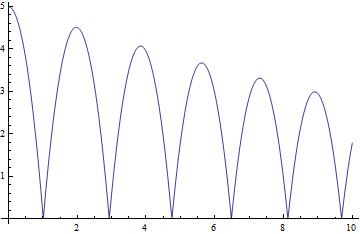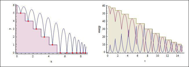produces: And again, we can also model the energy alongside it, and have the Wolfram Language punch up the graphics using Reap[] and Sow[] to obtain the coordinates of the ball at each bounce.