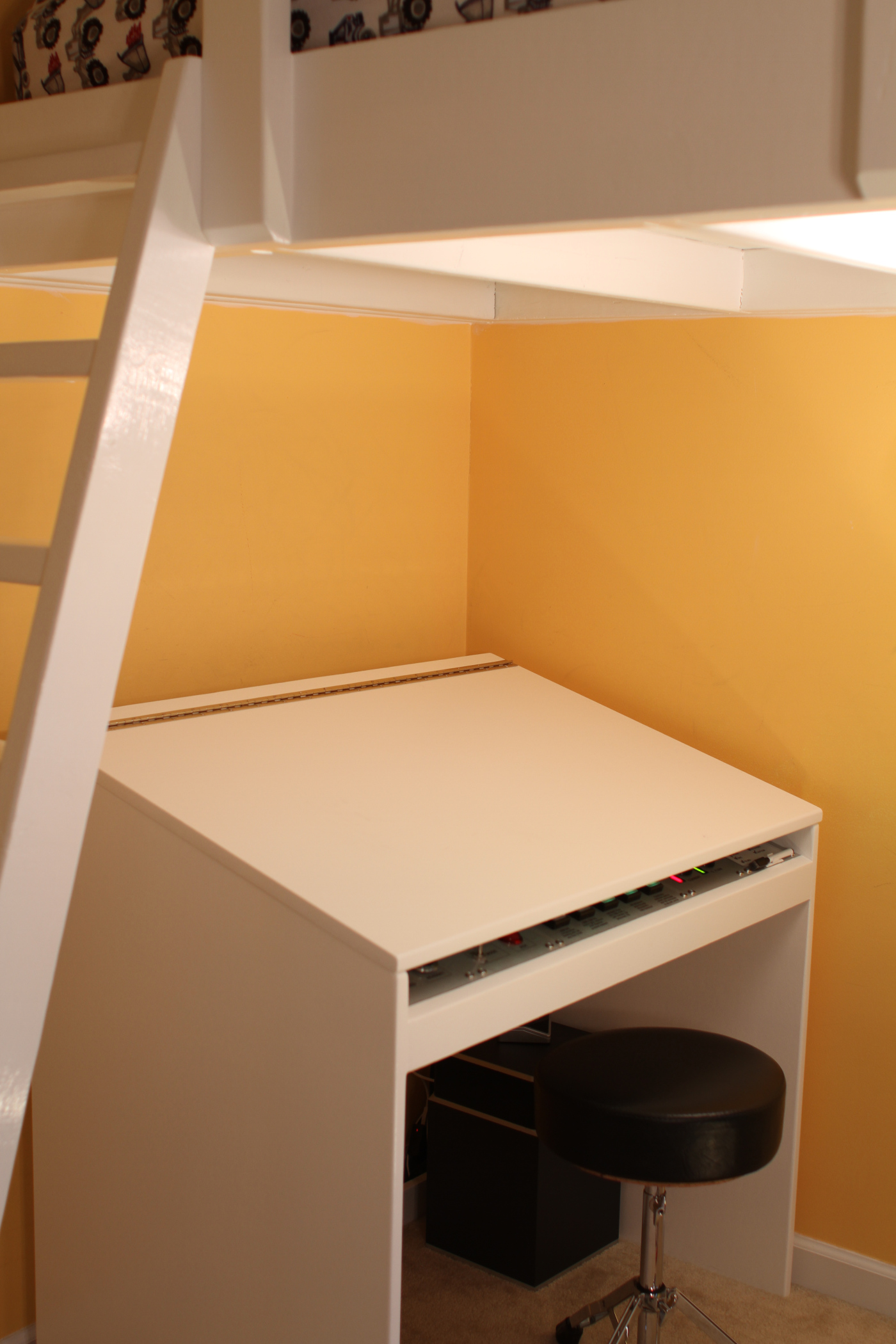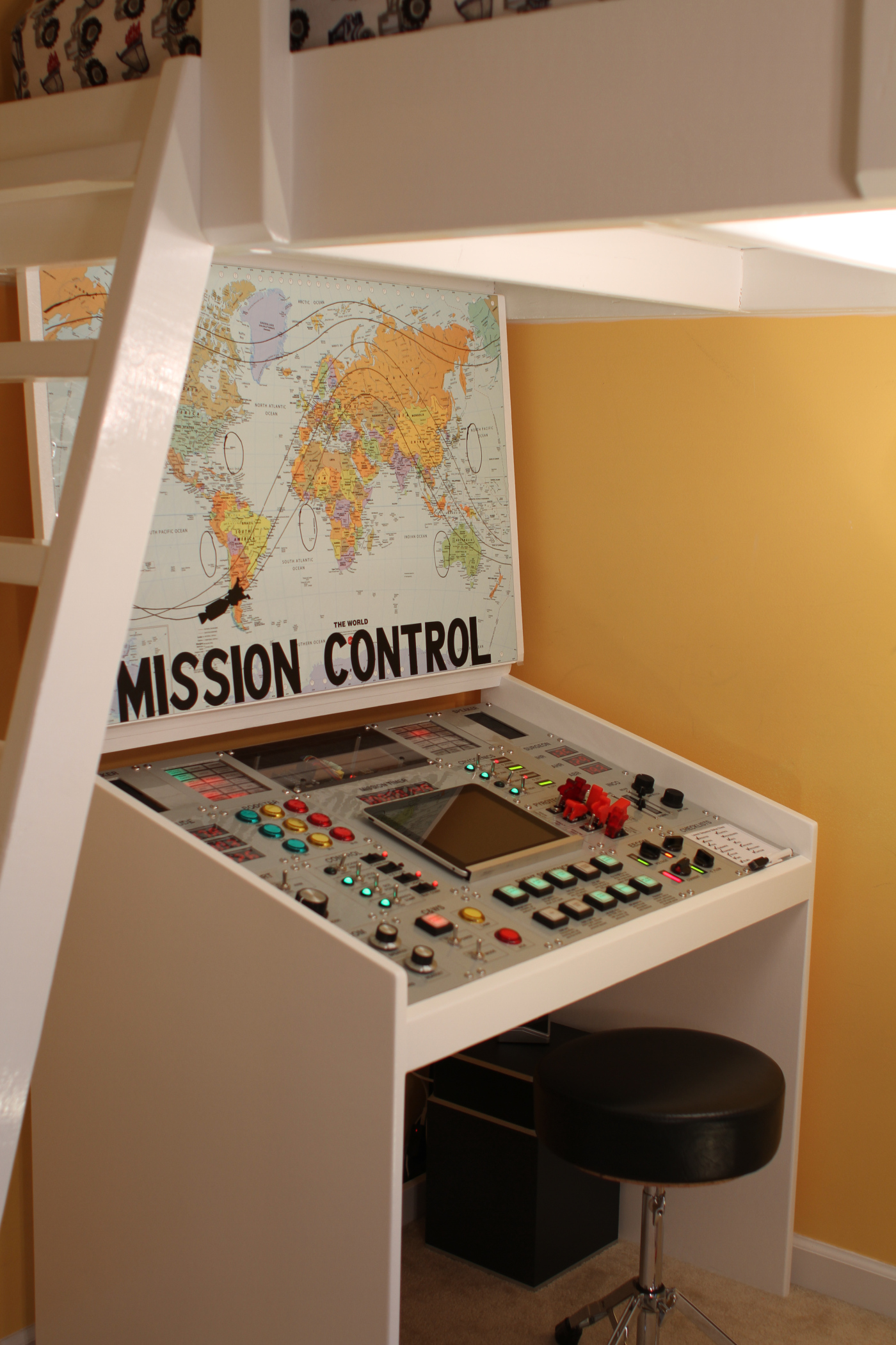 | Some parents take the carrot approach to homework enforcement, others the stick. This is the best carrot I’ve ever seen. Some world-class parenting skills are on display right here. This is the homework desk of Jeff Highsmith’s older son: And this is what it looks like when he’s finished his homework and is allowed to raise the lid. The desk came about as the result of a family visit to the Kennedy Space Center. It’s not an exact facsimile of an Apollo Mission control desk (the real ones don’t make whooshy fizzy rocket noises, deep mechanical clankings and exciting beepings, and, as Jeff says, they do more monitoring than controlling), but those of you who have seen the real thing will definitely recognise what this is based on. Here is a wonderful, wonderful how-to video which walks you around the build and the finished desk. We love the clear panel to display the Pi and the Arduino! (Eben got to the bit in the video where Jeff’s son issues the command to stir the oxygen tanks and shouted: “NOOOOOOO!”) The whole thing is run on a Raspberry Pi and Arduino, working together. Jeff says: