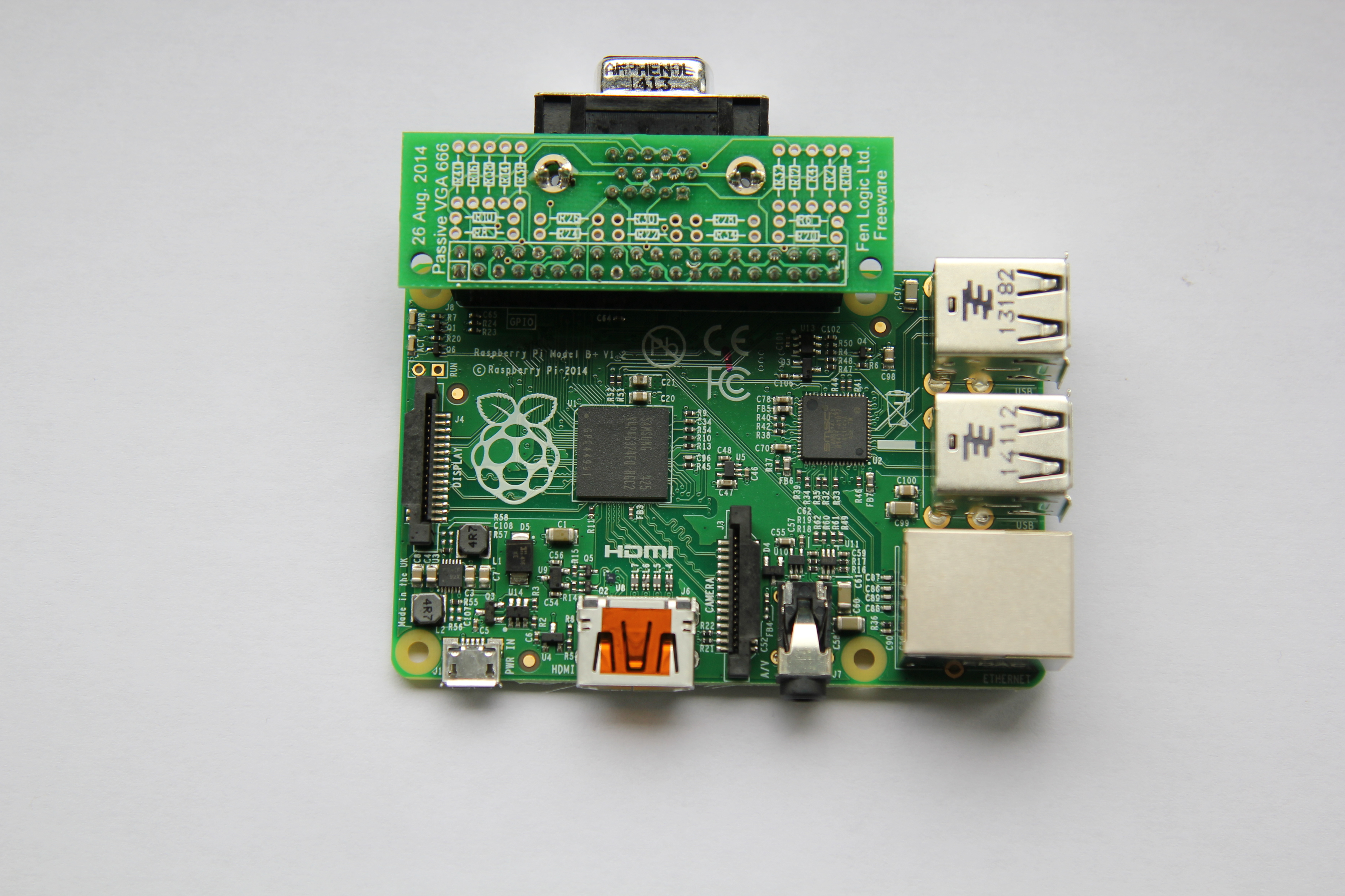 | The Raspberry Pi has an HDMI port to connect a display. If your monitor only has VGA, you have to use an adapter. Because this requires a digital-to-analogue conversion, those adapters can be quite pricey, and they can draw lots of power. So our friend Gert van Loo (who developed the Alpha board that became the Raspberry Pi, and the man behind the Gertboard and Gertduino) has created a VGA adapter that uses the Pi’s GPIO. This wasn’t possible on the Model A or B, but now the B+ exposes 40 GPIO pins, there’s more to play with. As well as just allowing you to connect a VGA monitor natively, it also means you can use it as a secondary monitor alongside HDMI. And unlike composite video, the DPI interface can be run independent of the HDMI. The software for dual screens is still under development, but we expect that to arrive in the next couple of weeks. Running two screens at maximum resolution will consume SDRAM bandwidth, and is yet to be tested. (And there’s a catch: as the board uses most of your GPIO pins, you lose access to them.) The VGA output supports the same resolution as your HDMI one: from 640 x 480 up to 1920 x 1024 at 60fps. At the highest resolution the pixel quality is almost as good as HDMI. The adapter uses a simple resistor ladder network as a digital-to-analogue converter, so the colour quality depends on how well-balanced your resistors are. There is slight colour banding, and with 6 bits per channel you have a maximum of 262144 colours. Dom has been working on the software side and the new DPI (read: VGA) driver software has been added to the latest release. “Where can I buy one?”, I hear you ask. Currently, nowhere. But Gert has made the VGA adapter open hardware, so you can make it yourself, or find yourself an enthusiastic partner and have it made. All the data is in the public domain on GitHub. Besides the manual and schematics, you will also find the database for the PCB and the Gerber files. The PCB design supports both through-hole and SMD parts. The design consists of: