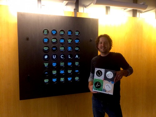 | Creative Director and Interactive Developer Michael Newman was tapped by UCLA Extension to design their 2015 winter course catalog cover. To accompany his work, he also designed, developed, and built a Raspberry Pi-powered interactive installation called Thirty-five Pixels which is currently on display at UCLA Extension’s 1010 Westwood building through the 2015 Winter Quarter. Although it uses a single 50″ LCD HDTV mounted vertically, the masking on the piece gives the effect of a 7 by 5 matrix of individual circular displays. On the inspiration for the design, Michael says: