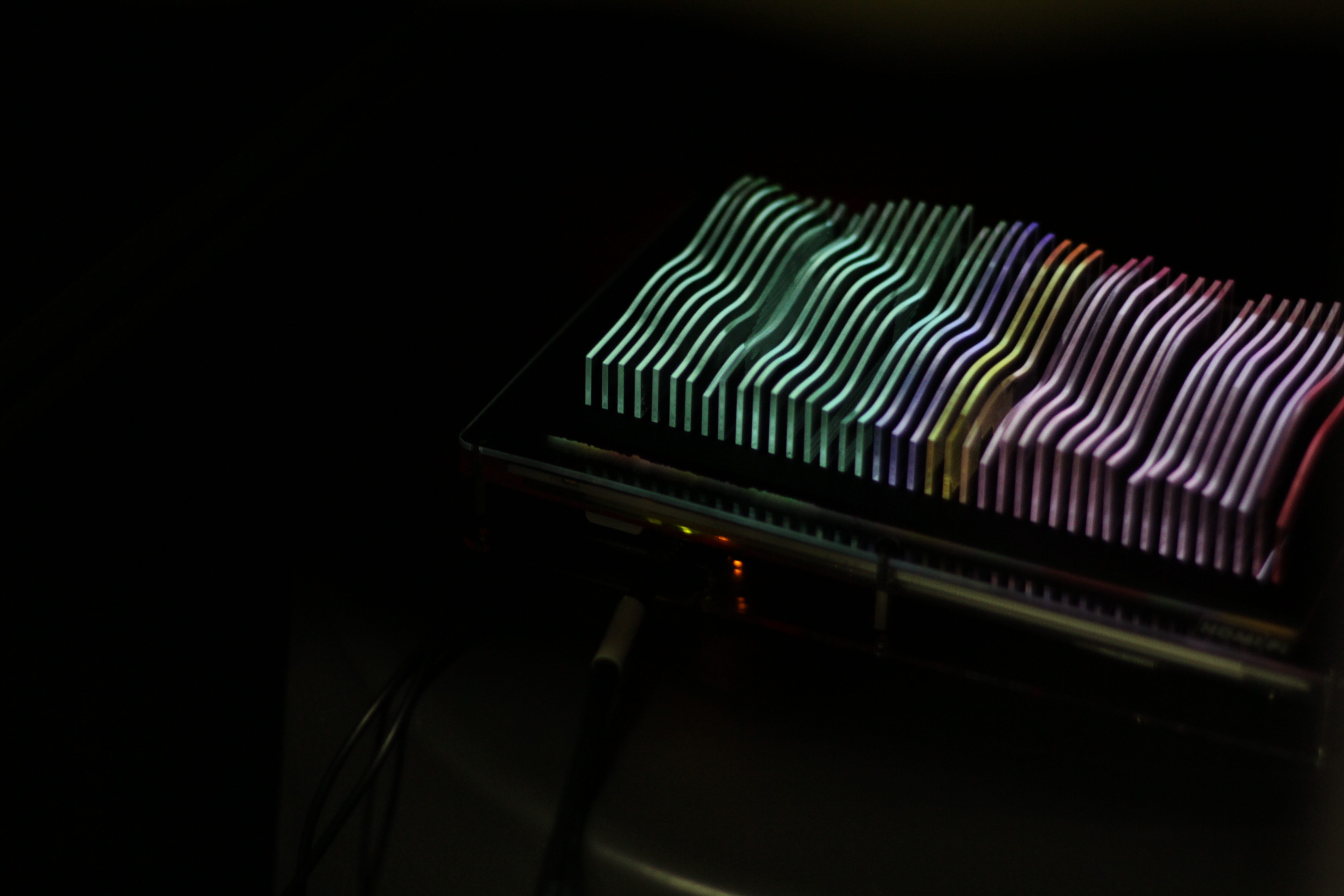 To make this experience of witnessing how the world feels and how frequently these emotions change more immersive, these visual representations are also accompanied with audio. We chose five audio tracks, one to depict each emotion, adding them into the web-page using the HTML5 audio tag, and adjusted their volume depending on the emotion-based twitter data with some JavaScript wizardry. This ended up with the clashing music types seemingly battling against each other, reflecting how hectic the live emotion states were and how rapidly they would change at random; one moment showing solely happiness, the next ultimate anger. The Hackathon Effect This was an Art Hackathon don't forget, so, of course we had to present this data in a beautiful and intriguing way. What's more intriguing than creating the illusion of 3D colour-changing ripples?! For this effect, the designers in our team laser cut clear plastic to create the individual ripples and slotted them into a black board. I decided this would be the perfect opportunity to whip out my Raspberry Pi! We ran the web-page through the Pi and hooked it up to the HDMIPi, allowing a bright screen for our structure to be placed onto, so that the moving coloured blocks from below would shine onto the clear plastic and give the illusion of a 3D object. Finally, the structure was put together in a dark, enclosed space, and the end product came to life, completely exceeding my expectations! Colours danced gracefully across the ripples, making us forget that there was even a web-page below. It was easy to get lost in the entrancing movement of pattern that the object seemed to create. As soon as you immerse yourself in the full experience, with audio as well as these entrancing visuals, it becomes a little overwhelming. Watching the colours is one thing, but hearing the clashes of audio really brings the message across that this is how people from around the world are feeling right now.