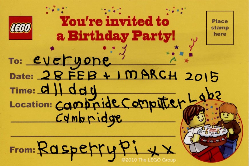 | Raspberry Pi turns three (three!) next month and we would love you to come to our birthday party! The party is so huge and packed full of stuff that we couldn't fit it into one day so we'll be taking over the University of Cambridge Computer Laboratory on Saturday 28th February and Sunday 1st March for the Raspberry Pi Big Birthday Weekend. It's going to be a buzzing behemoth benchmark of a birthday bash. Blimey! There will be captivating talks, animated hands-on workshops, informative show and tell sessions and chatty panel discussions. There will be a marketplace to buy the latest Raspberry Pi add-ons and other cool stuff. There will be competitions, prizes and goodies galore and a chance to chat with the Raspberry Pi team over a nice cup of tea. There will be gardens bright with sinuous rills and little, fez-wearing monkeys riding unicycles. You really don't want to miss it. Each day will be different so feel free to come to both. As well as two days of all things Pi there will be an actual fill-yer-cakehole party from 4.30pm to 7.30pm on Saturday evening with food and drink (including a surprise birthday beverage). So whether you're a seasoned Pi person, whether you got a Pi for Christmas and would like to learn more or whether you're just wondering what it's all about then come along—we'd love to meet you. The Raspberry Pi Big Birthday Weekend is going to be a joyous celebration of creativity, technology and community so get your tickets now! Tickets are a scandalously reasonable £2.50 and entry is free for under 16s. Get involved!The party will be a celebration of all things Raspberry Pi which of course includes the amazing Raspberry Pi community. We’d like you to get involved and we are looking for people to: